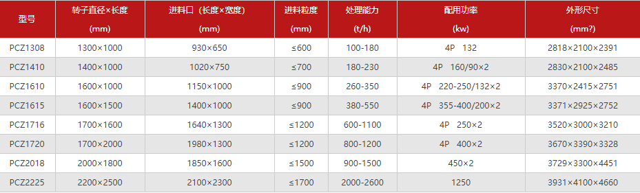 PCZ新型重錘式破碎機(jī)技術(shù)參數(shù)
