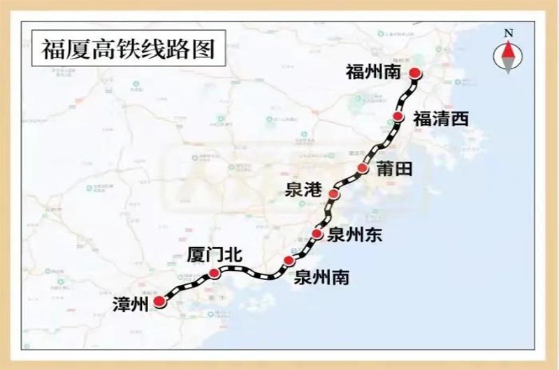 福廈高鐵線路北起福州市,南至廈門(mén)和漳州市,全長(zhǎng)277.42公里,設(shè)計(jì)時(shí)速350公里,共設(shè)福州南、福清西、莆田、泉港、泉州東、泉州南、廈門(mén)北、漳州8座車(chē)站。