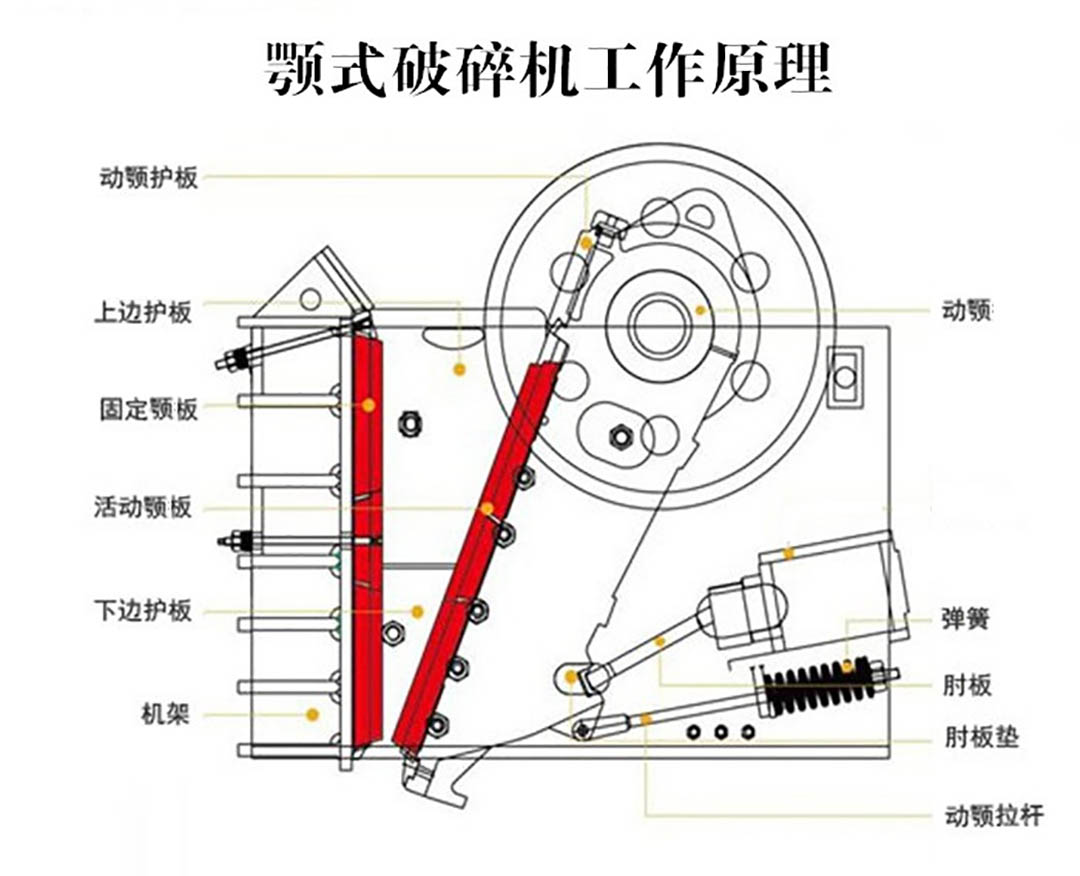 顎式破碎機(jī)由六大部分組成,分別為機(jī)架、傳動部分(電機(jī)、飛輪、皮帶輪、偏心軸)、破碎部分(動顎、動顎板、定顎板)、保險裝置(肘板、彈簧拉桿部)、調(diào)整部分、潤滑裝置。