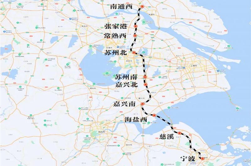 通蘇嘉甬鐵路位于江蘇省和浙江省境內(nèi),為南北向鐵路,線路北起南通市南通西站,與鹽通鐵路正線貫通,向南跨過長江后,經(jīng)過蘇州市、嘉興市后跨過杭州灣進入寧波市。